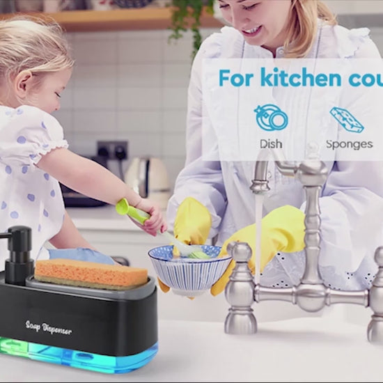 - 2-in-1 Design → Soap dispenser + sponge holder in one compact unit.