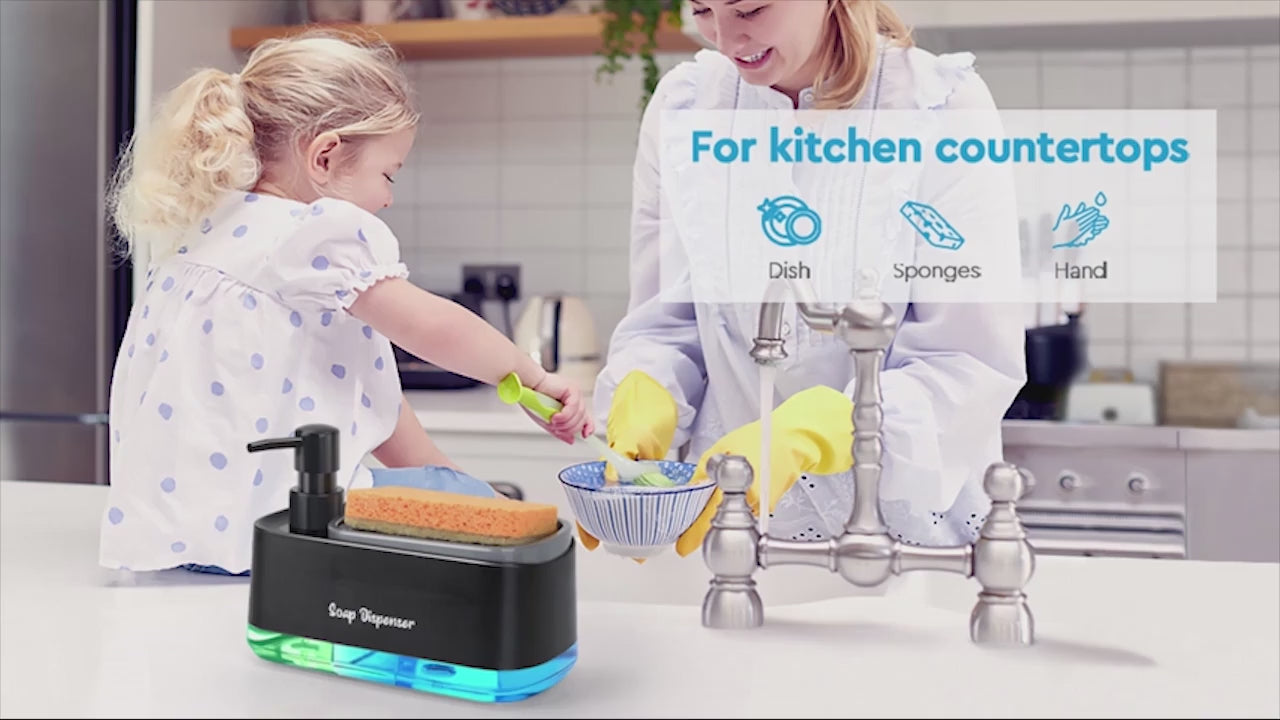 Just press the sponge on top, and the perfect amount of soap is pumped out—no spills, no waste, no clutter. The integrated sponge holder keeps everything in one place, making it perfect for kitchens, bathrooms, and countertops.