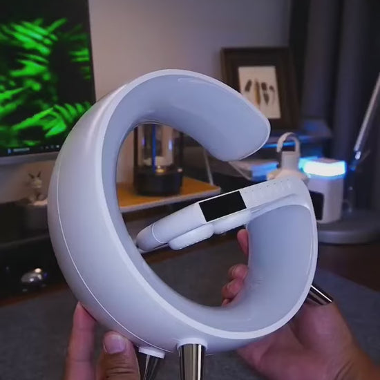 Transform your desk, nightstand, or living space with this 3-in-1 innovation — a stylish LED lamp, a wireless charger, and a powerful Bluetooth speaker, all designed in a modern G-shape.